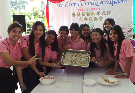 萱苏南塔皇家大学汉语营是清迈大学孔院长期开展的汉语体验活动之一,孔院结合了往届的汉语营活动经验以及最新的中国文化中心资源优势,为此次汉语营安排了两场文化体验活动。上午由孔院教师带领学生体验包饺子,在孔院老师们的指导下他们和面、擀饺皮的技艺不断提高,包饺子的水平也快速进步。最后学生们亲自下厨煮熟了自己包的饺子并激动地与同学和老师们进行了分享。