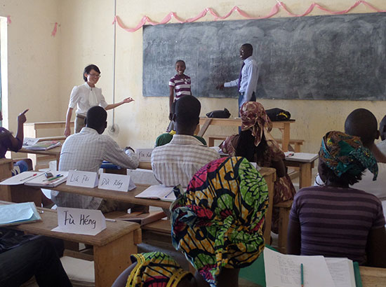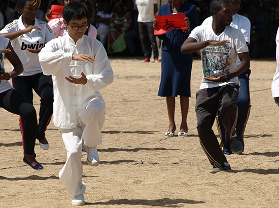 在开学典礼上,马鲁阿大学高师学院汉语专业学生特意准备了中文歌曲和太极表演。在中国老师们的指导下,汉语专业的学生门编排了中文版的喀麦隆国歌,并首次在马鲁阿大学的开学典礼上唱响,中喀国歌唱毕,太极表演便闪亮登场。伴随着悠扬舒缓的音乐声,汉语专业师生们行云流水、柔中带刚的太极表演让现场嘉宾及师生们惊羡不已。