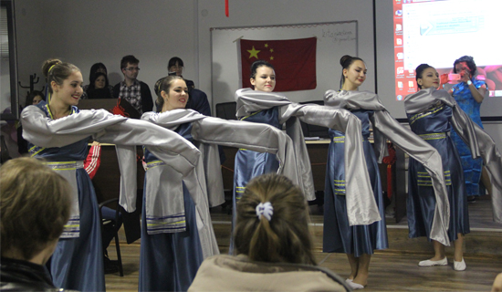 在中华文化知识有奖问答的环节,现场气氛非常踊跃,问答中穿插了由普大女生表演的中国传统扇子舞和蒙古族特色的长袖舞。