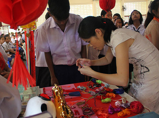 高一学生郭安成(Sompong Mayue)编出中国结手链,高兴地说:汉语是世界上最美的语言,中国艺术博大精深,希望自己毕业后有机会能去中国学习生活。