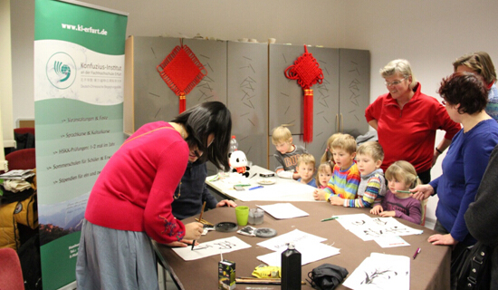 据悉,埃尔福特市的妇联中心隶属于埃尔福特市妇女及家庭中心协会(Frauen- und FamilienZentrum Erfurt e. V.),致力于丰富本市的家庭休闲活动并维护妇女及儿童的权益。基督降临节是德国当地重要的宗教节日,主要用于筹备庆祝耶稣基督降生的活动,即迎接圣诞节的到来。妇联中心举办的基督降临节集市到今年已经是第十届了,该活动同时也是妇联中心的开放日,每年都会吸引众多当地市民及游客前来参加。埃尔福特孔院受邀参加此次活动,不仅展示了中国书法以及国画的魅力,同时也为外国友人提供了学习汉语、书写汉字的机会。