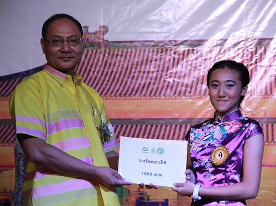 普吉中学校长Mr. Utain Jitsumruay致开幕辞。经过激烈角逐,来自普吉Dowroongwittaya学校的9号选手李佳虹以一首《小苹果》荣夺桂冠。