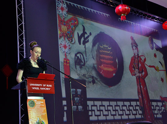 下午,鲁塞大学学生举办中国文化主题讲座及知识竞猜和文艺表演。鲁塞大学副校长伊利耶夫教授做开题演讲。大二学生莫妮卡介绍了中国和神奇的中国龙,并伴有精彩的舞龙表演;大四学生高明演唱rap版的《龙的传人》,赢得场下一片喝彩。大三学生何英俊做了《中国的民族和传统服饰》主题演讲,伴有民族服装表演和旗袍秀,姑娘们穿着各色旗袍,优雅地扭动着袅娜的身姿,完美展现出西方美女穿中国旗袍的中西合璧之美。