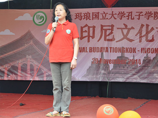 玛琅国立大学孔子学院中方院长覃小禾致辞,她希望通过此次活动加强中印尼文化交流,加强孔子学院与玛琅地区汉语爱好者的联系。