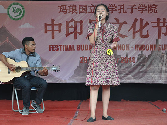 一支中国舞蹈《茉莉花》和一支印尼传统舞蹈拉开本次歌曲比赛的序幕,一首首悠扬动听中印尼歌曲赢得观众阵阵掌声。经过激烈角逐,来自普拉维基亚大学的Suharto和来自玛琅国立大学的Sonya S.P.I.获得大学组中文歌曲一、二等奖;来自玛琅国立大学中文系的Galuh B.U.和M. Deny Ramadhan获得大学组印尼歌曲一、二等奖。来自Turen第一国立中学的四人组合和来自Al-Maarif Singosari伊斯兰中学的Sandy G.、Seyla R.分别获得高中组中文歌曲一、二等奖;来自Al-Maarif Singosari伊斯兰中学的Zakiyatul M.和来自玛琅第五国立中学Alfreda C. 、Eunike L.P.分别获得高中组印尼歌曲一、二等奖。