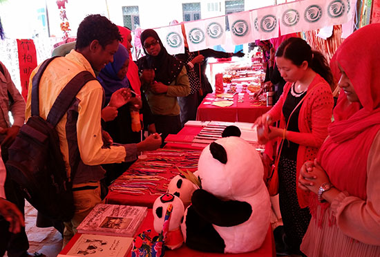 文化展区内,丰富多彩的中国文化元素吸引众多师生驻足观看。喀土穆大学孔子学院志愿者为现场观众讲解了中国结、剪纸、手链等小工艺品的制作方法,作为中国传统文化的象征,中国结给人以团结亲密的感受,学生们纷纷亲手编起了中国结。