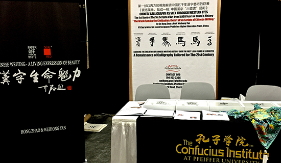 北卡罗莱纳州费佛尔大学孔子学院展台十分引人注目。这里展出了由闫伟红院长设计并编写,中国著名书法家、首都师范大学教授赵宏亲笔书写的《囊括万殊,裁成一相:中国汉字“六体书”艺术》。
