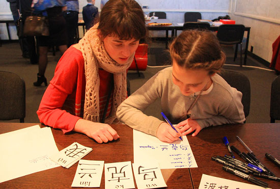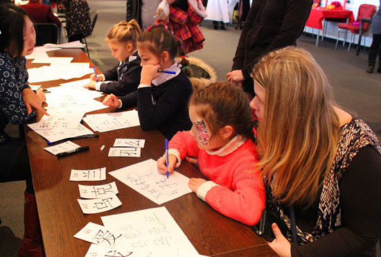 活动大厅两侧的“汉语体验课堂”成为人们驻足停留、亲身体验的第一站,孩子们一看到汉字便眼睛一亮,纷纷踊跃参加。第一次接触到神奇的汉字,孩子们就被她迷人的魅力所吸引。个个聚精会神,认真听讲,跟随孔子学院教师学习发音、笔画,积极回应老师的提问、辅导和训练。
