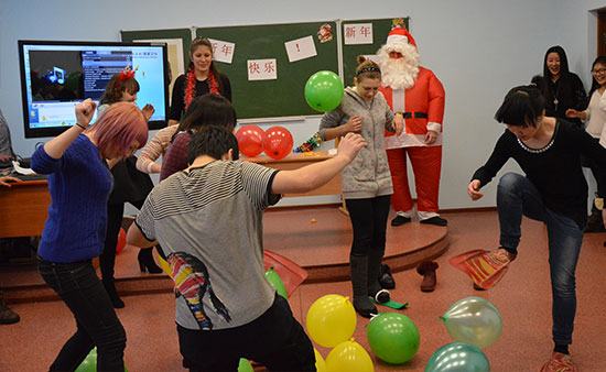 随后,外语系学生带来活力四射的《新年欢乐颂》开场舞,瞬间点燃全场。孔子学院院长与学生一起表演“新年传统习俗”看图说讲节目,精美的菜肴,恰到的说讲令参与者垂涎三尺。“拳击手剥桔子”和“夹气球双人舞”环节中,中俄大学生组合互动比拼;小品《猜猜我是谁》将联欢活动推至高潮。最后,联欢活动在“我与圣诞老人跳起来”的全场歌舞秀中落下帷幕。