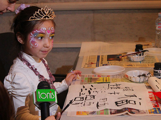 小女孩现场接受乌克兰媒体采访谈体验中国书法的感受