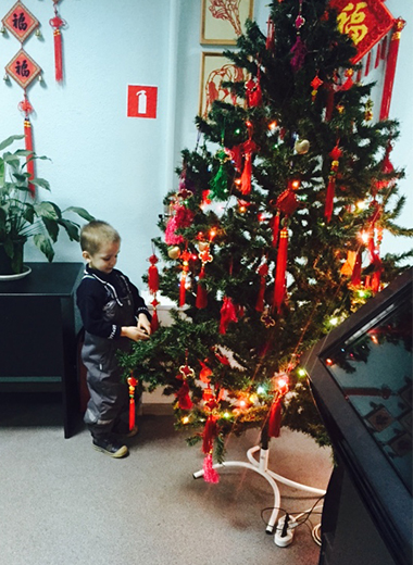 孔子课堂学生装饰新年枞树