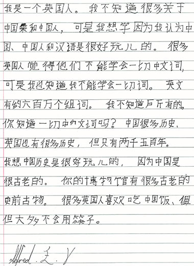 年龄较大的学员用汉字抒发他们对中国的认识和赞美:“每当我想起中国,首先出现在我脑海里的是中国地图,像一只大雄鸡。”“我心中的中国是一个美丽的地方,她拥有我每天挂念的家乡。”“想起中国,我就会想到国内有我的爷爷、奶奶、外公、外婆,他们会做好多好吃的饭菜。”“我每年都和爸爸妈妈一起回中国,去许多不同的地方。今年夏天,我登上了长城。我可以自豪地说:‘我是一个中国好汉。’”……
