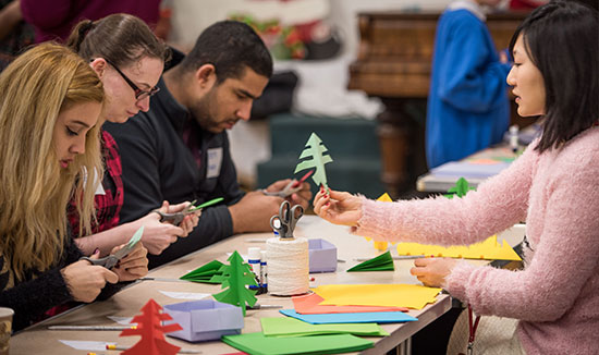 学员们通过中国剪纸、折纸、书法和绘画制作圣诞卡和圣诞树,并书写圣诞祝福。“我要把这个圣诞树送给我的妈妈”,一位学生说,“是一个“春”字,但很像圣诞树。”