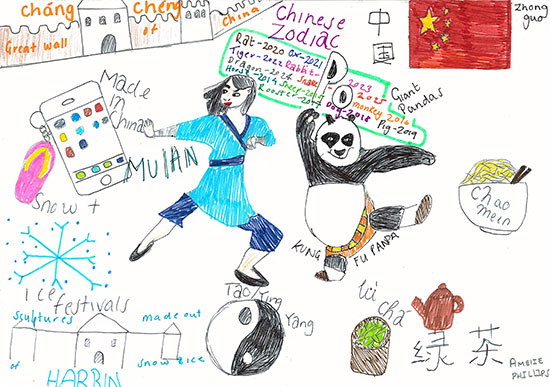 12月6日,孔子学院青少年部举行“我心中的中国”绘画和写作比赛。小学员们各显其能,用绘画的形式表达他们心目中的“中国”,一幅幅含有灯笼、烟花、长城、红五星、亭台楼阁、熊猫、竹子、金鱼、中国龙、凤凰等中国元素的绘画呈现在师生面前。学员Amelie把所有她知道的“中国元素”汇集成一幅中国“交响乐”图画,赢得现场观众的赞美。