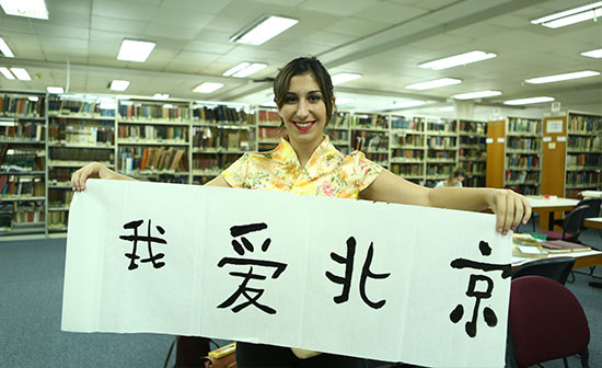 特拉维夫大学孔子学院师生穿着喜庆的中国风服饰,录制节目——中国民歌《茉莉花》。在特拉维夫大学中央图书馆,两位曾赴人民大学参加2014年国际暑期小学期的学生,娴熟地摆开文房四宝,展示了中国书法技巧,手写“我爱中国”和“我爱北京”横幅向中国观众表达新年祝福。
