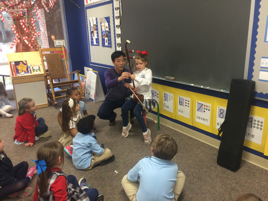 新学期伊始,孟菲斯大学孔子学院教师张蕾、储博在所任教Christ Methodist Day School举办了一次中国传统乐器和舞蹈欣赏及体验活动。
