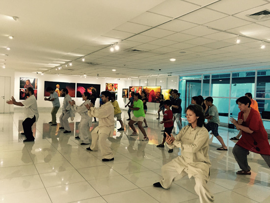 学员们在摄影展示大厅学太极