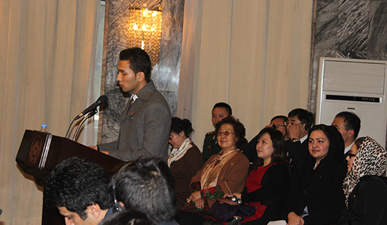 喀布尔大学孔子学院组成的合唱团现场演唱了阿中两国国歌,气势宏伟,赢得热烈掌声。孔院(中文系)代表Hamid以流利的中文发言,分享自己学习汉语的经历,表达了对中阿两国关系的良好祝愿,以及对中国政府的诚挚感谢。