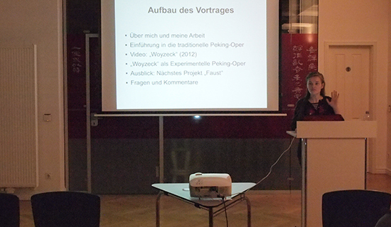 Peschke女士简要介绍了京剧的历史、四种艺术手段以及四大行当,亲身示范京剧的艺术表现形式,即综合性、提炼和程式。随后,她以短片向观众介绍如何以京剧形式表现德国家喻户晓的戏剧《沃伊采克》,该剧作者为卡尔·格奥尔格·毕希纳,京剧的表演形式很好地体现出主人公沃伊采克的绝望与无助。