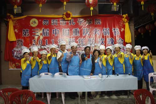 2011年1月2日晚,勿洞市孔子学院隆重举办"第三届中国重庆火锅美食节暨2011年新年联欢晚会"。泰国也拉府勿洞市陈进森市长、侨界领导黄桂忠先生、报社记者、特邀嘉宾以及孔子学院师生共计120人聚集一堂,热热闹闹品尝火锅,红红火火迎接新年。