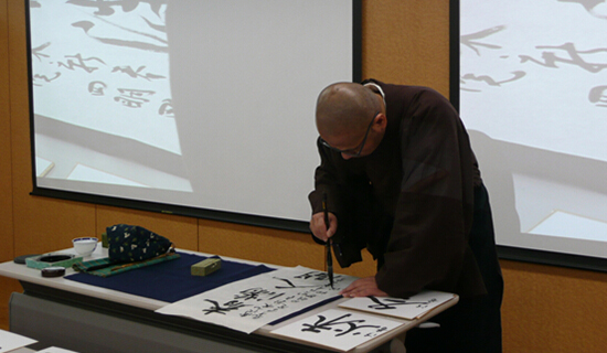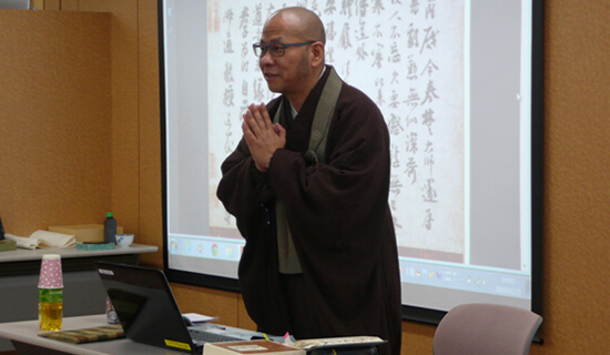 此次讲座邀请到日本驹泽大学佛教经济研究所的研究员、书法家胡建明博士。胡博士祖籍中国上海,早年于浙江宁波天童寺出家,后求学于驹泽大学、东京艺术大学、中国人民大学等高等学府,并在日本曹洞宗大本山永平寺等道场挂锡修行,于佛道、书画方面造诣颇深。