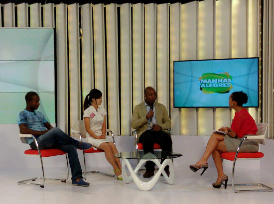 1月20日上午,莫桑比克蒙德拉内大学孔子学院志愿者教师张爽及学生乔治和Emidio应邀做客莫桑比克社会电视台早间《Manhas Alegres》(《快乐上午》)节目。