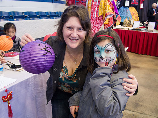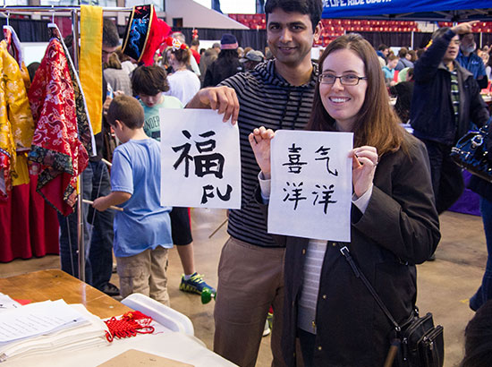 其中最受欢迎的是北卡州立大学孔子学院的展台,从入场开始直至活动结束,孔子学院展台前参观的游客从未间断过。孔子学院教师写新年祝福,送花灯迎新。观众临摹书法试汉服,帅哥美女中西合璧。