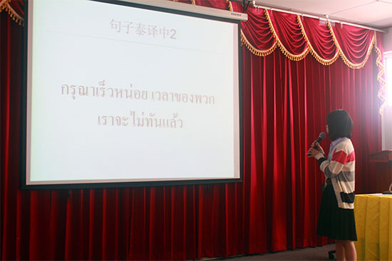 决赛中,各选手经过精心准备胸有成竹,词汇的中泰双语翻译部分大多数选手都应答入流,轻松过关。中文语段的翻译,题目难度较往年有所加深,现场气氛顿时紧张起来,观众们都屏住呼吸期待选手们的表现。来自黎逸皇家大学的罗文萱成为全场的焦点,只见她信心满怀地走到前台选择赛题,当大屏幕上出现中译泰句子“近日,一些网友发布信息,号召节约粮食:拒绝浪费,从我做起。并晒出自己吃光的盘子,一起向舌尖上的浪费说‘不’。”时现场观众不禁为罗文萱捏了一把汉汗,句子不仅考验语法知识,还涉及时下流行话题。只见罗文萱冷静应战,准确流利地翻译出了相对应的泰语。