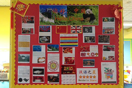 此次板报墙由孔子课堂汉语教师冉超设计制作,以“你好,中国”(Hello,China)为主题,以中国传统文化节日为线索,以“汉语之星”版块为特色,辅以中国历史遗迹和自然风光及中国特色饰品,洋溢着喜庆、团圆、祥和的氛围。