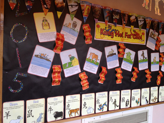 学生们用十二生肖布置了走廊里的墙报,以此迎接马上到来的羊年春节,在此过程中,大家不但学习了十二生肖的名称,同时也了解了中国的生肖文化。在舞狮活动中,学生们的热情极其高涨,每个人都争先恐后地参与其中。