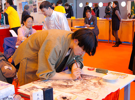 孔子学院志愿者教师陈仕骋在展会的醒目位置铺上宣纸、摆上砚台、提笔挥毫,向参观者们现场展示具有浓厚中国韵味的水墨山水画的创作过程,吸引众多观众驻足观赏。