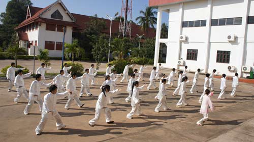继国画课展示其静态美之后,孔子学院又带领学员们欣赏到中国太极拳的动态之美。为期两周的太极拳教学,让本已对中国功夫崇拜已久的老挝学生们欣喜不已。在老师的带领下,学员们将二十四式太极拳打得像模像样,孔子学院还挑出了部分学员,着传统中国太极服,组成30人的方阵,在老挝国立大学大礼堂前公开表演,受到校内师生普遍欢迎。