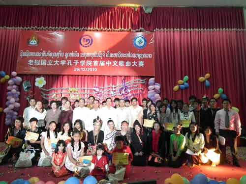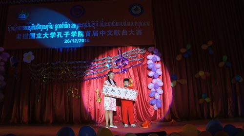 12月26日,老挝国立大学孔子学院首届中文歌唱比赛在国立大学大礼堂隆重举行。老挝国立大学校长、副校长、各学院领导一同观看了比赛。尽管大部分选手只学了三个月的中文,但颇具艺术天赋的老挝学生们都能将难度不小的中文歌曲拿捏到位,如周杰伦的《星晴》《千里之外》、王力宏的《大城小爱》《kiss goodbye》等,赢得中国老师们的一致赞赏。比赛期间,还穿插了由孔子学院学生带来的老挝传统舞蹈以及由中国老师献上的现场书法和配乐诗朗诵,和谐地交融了中老两国的传统文化。整堂比赛气氛火爆,礼堂里掌声不断,最终,初级班D8班的韬温乔以一曲老挝歌迷较为熟悉的《童话》赢得比赛冠军。