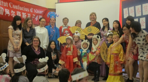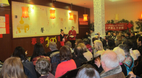 2月8日,阿尔萨斯孔子学院与斯特拉斯堡学生学者联合会合办羊年春节联欢会。三百多人的场地里座无虚席。孔院儿童与成人学员用学到的汉语载歌载舞。熊猫班的一对小学员背诵的《木兰辞》受到热烈欢迎,毛毛班和乐乐班给观众带来了国产动画《喜羊羊和灰太狼》主题曲《别看我只是一只羊》配乐的舞蹈,萌翻所有观众。最后孔院教师和学员一同登场,伴着风靡全国的大众神曲《小苹果》,邀请场下的中法观众共舞,掀起联欢会高潮。