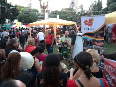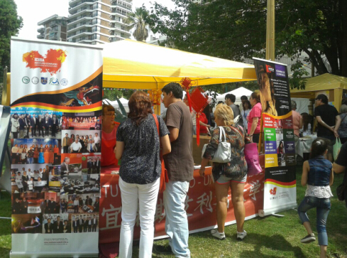 布宜诺斯艾利斯大学孔子学院展位位于中国城附近的Belgrano公园。展位采用充满浓郁中国特色的设计,所使用的红灯笼、中国结等中国传统文化元素深深的吸引了阿根廷公众和在当地游览的外国游客。