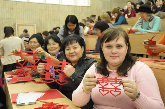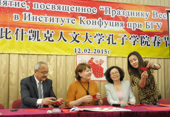 2015年2月12日,为迎接中国传统新年,比什凯克人文大学孔子学院与奥通巴耶娃基金会合作举办了第一期比什凯克市中小学教师剪纸培训班。吉尔吉斯斯坦奥通巴娃基金会第一执行官原教育部副部长肯迪勒巴耶娃•多歌杜古丽(Kendirbaeva Dogdurgul),比什凯克人文大学校长穆萨耶夫•阿不都达(Musaev Abdulda)作为嘉宾出席,近200名比什凯克市郊中小学、幼儿园教师积极参加。