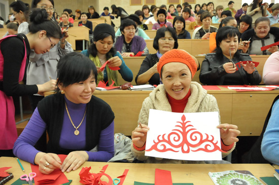 吉尔吉斯斯坦奥通巴娃基金会第一执行官原教育部副部长肯迪勒巴耶娃•多歌杜古丽(左二),比什凯克人文大学校长穆萨耶夫•阿不都达(左一)现场学习剪纸