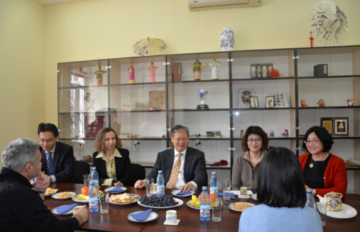 随后,在孔院的会议室里,大使和孔院全体老师亲切座谈。会上气氛热烈,大使首先给孔院老师们拜年,祝福孔院及老师们在新的一年里发展更好,工作生活都美满。他还提到,大家都是远离祖国故土,为了传播中国文化这个共同的目标聚在一起,都是有志青年。谈话中,大使高度肯定了布大孔院建院一年多以来取得的成绩,并勉励大家提升自己的能力素质,做好中国文化的传播使者。