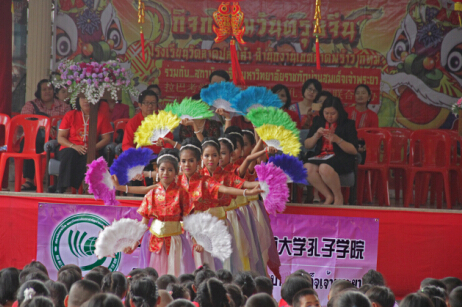 联欢活动开始,老师向同学们介绍了春节的来历及相关文化知识,并进行了有奖竞猜。随着舞狮鼓点的敲响,拉开了表演的序幕,两头活波可爱的狮子进入活动现场,立即引起在场同学们极大兴趣,争相与狮子嬉戏。随后由拉巴考学校学生舞蹈社表演的舞蹈《荷塘月色》,双语班学生表演的舞蹈《发财发福中国年》,五年级学生演唱的歌曲《月亮代表我的心》等节目,博得了在场嘉宾及学生们的阵阵掌声。曼松德孔子学院学生也带来的极具中国特色的胶州秧歌《微山湖》,更是将联欢活动推向了高潮。两校演员共同登台演出,为活动增添了喜庆气氛。曼谷市教育局官员高兴地观看了演出,并向演员赠送了新年礼物。