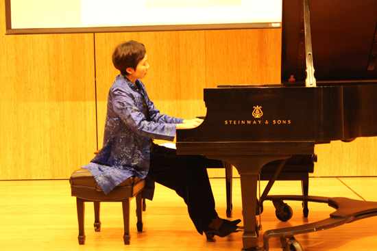 在孔子学院院长刘美如教授的主持下,盛宴拉开帷幕。云惠琳教授先从历史的角度介绍了钢琴在中国的发展情况。她以50年代的兰花花(汪立三作曲)、60年代的孔雀组曲(杨正伟作曲)和90年代的民乐五音——宫徽商羽角(姚晨作曲)为例,演奏并展示了当时中国钢琴音乐和民歌联系密切、贴近自然并表达内心情感的特点。