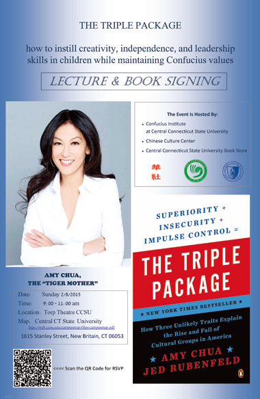 2015年2月8日,美国康州中央州立大学孔子学院(CCSU)邀请,耶鲁大学法学院教授、因育儿经著书立说而饱受争议的蔡美儿(Amy Chua)在CCSU举行了一场讲座,分享了自己的成长经历以及家庭教育经验,并着重就2014年的一部新作《成功三件套:三种似乎不可能的因素如何成就某些文化族裔在美国的兴衰》的内容做了阐释,最后就如何教育下一代提出了自己的几点建议。当地华人社团Chinese Culture Center和CCSU书店合作组织了此次讲座活动,200多人聆听了讲座。CCSU孔子学院外方院长Steve Kliger主持了讲座。
