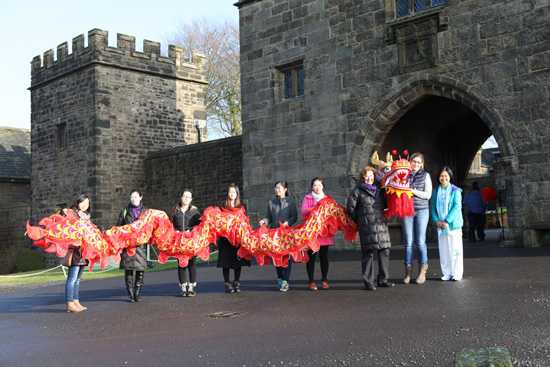 2月15日,位于普雷斯顿郊外的已有450年历史的豪顿贵族古堡庄园(Hoghton Tower)开放大门,欢迎来自孔子学院的长达10米的中国龙。作为豪顿家族第14代爵士,伯纳德.德.豪顿爵士(Sir Beard de Hoghton)与夫人和女儿热情而又周到地为孔院教师和志愿者安排了在古堡内外的文化演示活动场地,并将孔院活动广而告之,吸引众多人士前来参与。孔院教师和志愿者与当地民众一起,在古堡旁的集市上、在古堡的庭院里舞龙游行,喜气洋洋。在古堡的大堂里,英国的成年人和孩子们在学习着中国的太极拳和太极剑;在古堡的客厅里,不同国别、不同种族、不同年龄的人围坐一起,或下棋博弈,或剪双喜汉字,相谈甚欢,其乐融融……