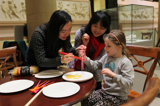 活动现场,《当代中国新貌图片展》色彩明快,生动传神,使人耳目一新;源自不同朝代的中国古币形状各异,制作精良,堪称艺术佳品;优雅的中国茶艺表演既揭示了各类名茶的自然属性,又诠释了品茶人应有的平和宁静之心,令人回味无穷……在“汉语角”和“唐诗角”,孔院教师和志愿者与英国诗人共诵名诗绝句,从中寻觅自己的创作灵感,体悟跨时空的文化感动;体验中国书法、绘画、珠算、折纸、剪纸、筷子游戏的场所则成了寓教于乐的英国少儿工作坊——在孔院教师和志愿者的细心指导下,孩子们认真、愉快地从事着动脑又动手的创造性劳动。在博物馆外面的广场上,孔院教师还进行了刚柔相济的太极扇表演,并组织在场的男女老少学踢毽子,增进身心健康。