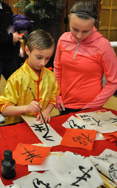 来宾们在品尝中式点心的同时,欣赏了舞狮、舞龙、书法、武术、民族舞蹈等表演。书法和手工展台边人流络绎不绝,大家纷纷参与其中,或拿起毛笔写上自己喜欢的吉祥汉字,或亲自动手给自己做一只灯笼。来自孔子课堂Edgelea 小学的40名身穿中国传统服装的小朋友们合唱三首中文歌曲,成为招待会最大亮点。