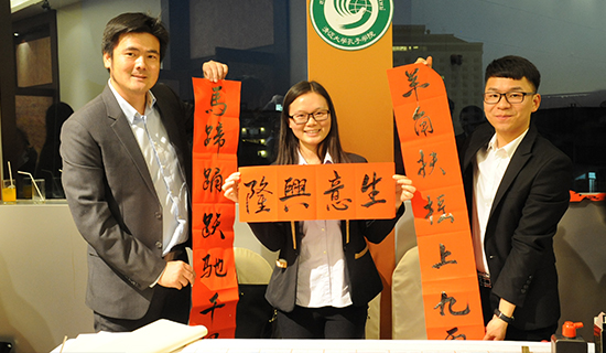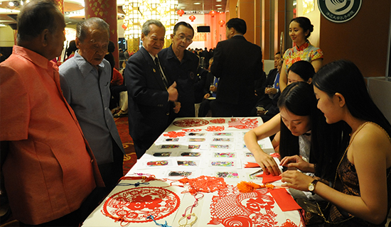 清迈大学孔子学院在会场外布置了书法、茶艺、剪纸及图书展示区供参加招待会的全体嘉宾欣赏体验。在书法展示区,清迈孔院志愿者书写下一幅幅满载祝福的对联作为新春贺礼送给在场嘉宾,茶艺展示区则以一杯杯热茶迎来送往,图书展示区更是吸引了很多华侨华人,纷纷止步认真阅读。