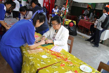 体验区“学以致用”,欢笑不断。“学拼音,吹蜡烛”、“记生词,赛BINGGO”、“拼拼图,学剪纸”……汉语专业班的学生把自己平时学的汉语知识,通过各种游戏的方式教给参观者,让他们在快乐的游戏中体会学汉语的乐趣,同时也建立了自己学习汉语的信心。