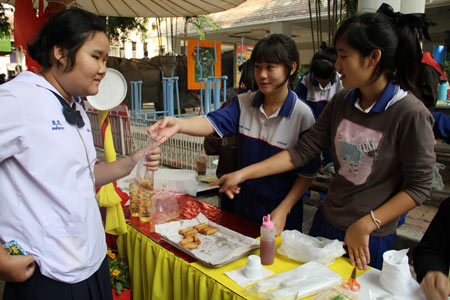 美食区多“滋”纷呈,香飘四溢。这边,学生和面、擀面、搅馅,忙得不亦乐乎,不一会儿一个个皮薄馅大的饺子或蒸、或煮、或炸,摆了满满一桌;那边,身着旗袍的学生在热闹中独辟一方清幽,温壶,烫杯,装茶,高冲……低斟,为前来参观的师生奉上一杯润滑甘醇的乌龙茶;此外,中国多种传统小吃,如包子、米粉、春卷、煎饼……经过学生的巧手纷纷亮相,各占一席,用自己的色香味吸引着泰国学生的胃。