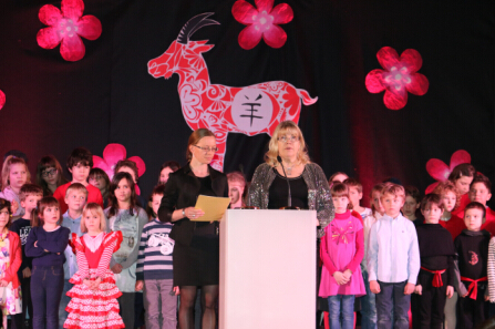 演出现场洋溢着浓浓的“年味”:由师生一起设计制作的具有中国剪纸特色的“羊”体现了新春佳节的特色。伴随着来自四个小学的孔子课堂学生用汉语演唱的“新年好”歌声演出正式拉开帷幕。首先,出席活动的中国驻斯洛文尼亚大使张宪一先生向大家祝贺新春,祝愿师生、来宾羊年学业进步,全家安康,祝愿中斯友谊地久天长。