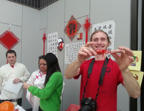2月14日下午,尤金太极拳武馆梁永祥师父身着马褂长袍,携其弟子,来孔院展台挥毫助兴,所书“羊年吉祥”、“迎春接福”等为孔院及尤金当地居民送上了诚挚的祝福。孔院志愿者所书书法作品也让梁师父称赞不已,兴之所起,当场即用粤语高声吟咏书法作品里的诗句。伴着悠扬的古筝琴音,南京师范大学访问学者康庆武教授亦在孔院展台前表演了《苌氏武技》,引得不少居民驻足观赏。