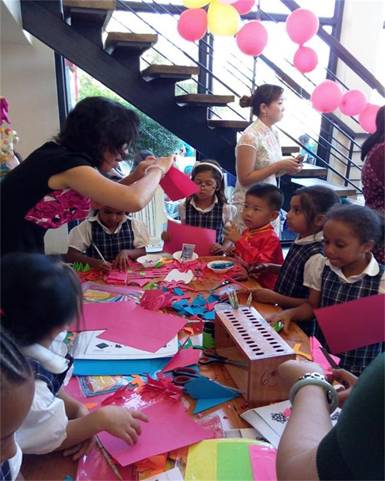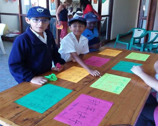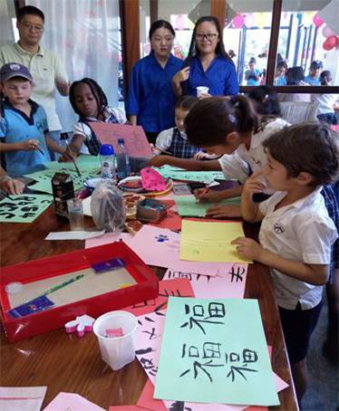 当天当地时间下午三点半,伴随一曲喜庆的“金蛇狂舞”乐曲,布拉依本汉语基地“新春联欢会”正式拉开帷幕。活动大厅张“灯”结“彩”,大红中国灯笼厅外高悬,艳丽的中国“结”、红红的春联、吉祥的“福”字挂满四周,不同肤色的师生、家长们个个兴趣昂然,不停地往来、观赏、参与、甚至陶醉于联欢会现场的“中华美食”、“书画体验”、“剪纸学习”、“娱乐游戏”、“拜年吉祥话”等各个不同的文化体验专区里,沉浸在以“中国传统文化体验”为主题的节日氛围中。